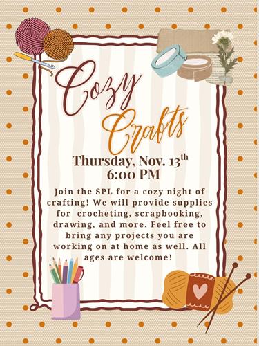 Name: Cozy Crafts at Stephenville Public LibraryDate: November 13, 2025Time: 6:00 PM - 7:00 PM CSTWebsite: Click here to follow us on Facebook!