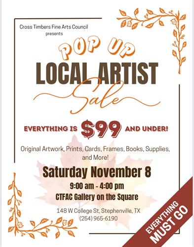Come and join Cross Timbers Fine Arts Council on the square for our Pop Up Artist One Day Sale!