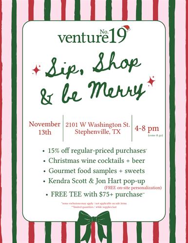 Name: Sip, Shop & Be Merry at Venture19Date: November 13, 2025Time: 4:00 PM - 8:00 PM CSTWebsite: Click here to visit our website!