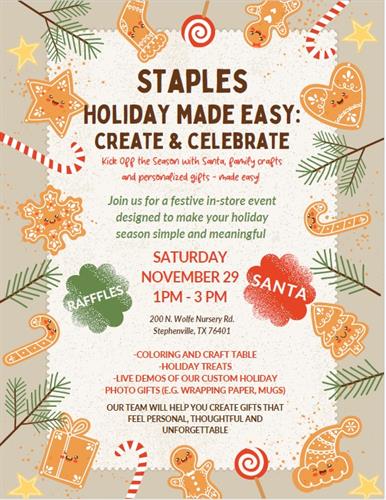 Name: Staples Holiday WorkshopDate: November 29, 2025Time: 1:00 PM - 3:00 PM CSTWebsite: Click here to visit our webpage!